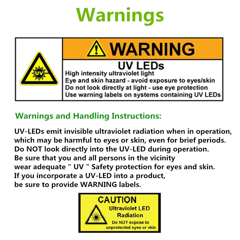 | 120 LEDs/m (IP67 Waterproof) | 1 × UV LED Strip 120 LEDs/m, 5M (IP67 Waterproof), user manual |